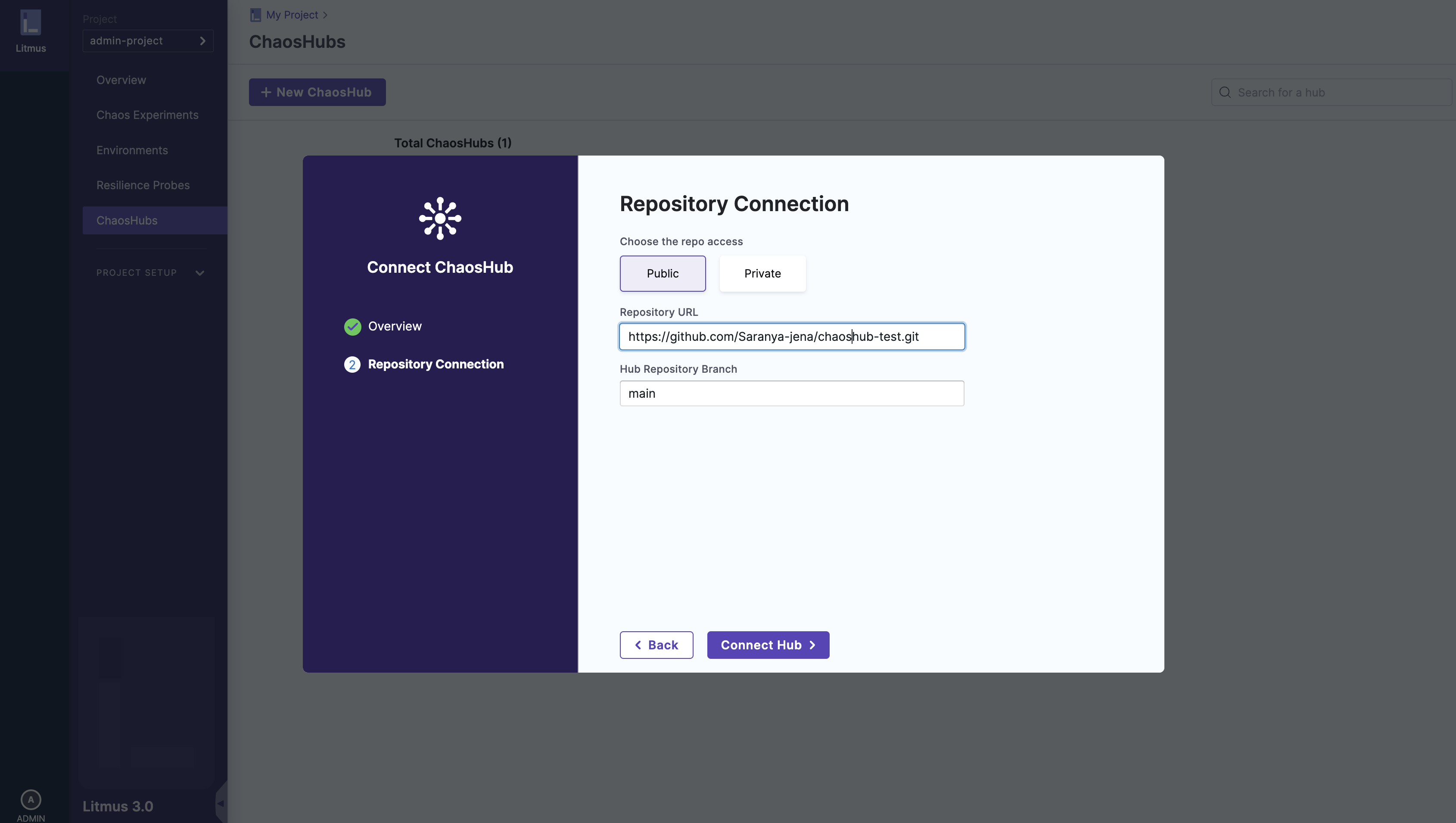 • Chaos experiments can be created from the public ChaosHub which is already connected to your ChaosCenter, or a custom ChaosHub which is a fork of the public ChaosHub where custom faults can be stored.
